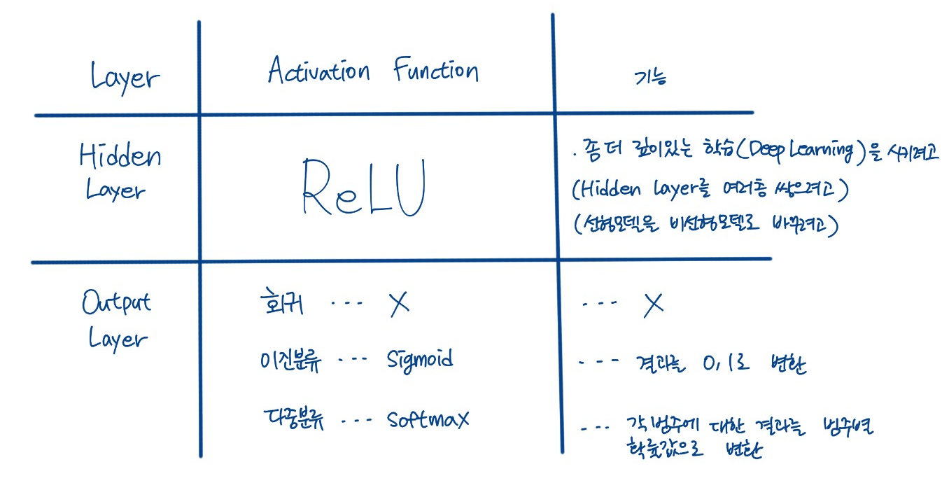 - Softmax : 각 Class 별(Output Node)로 예측한 값을, 하나의 확률 값으로 변환