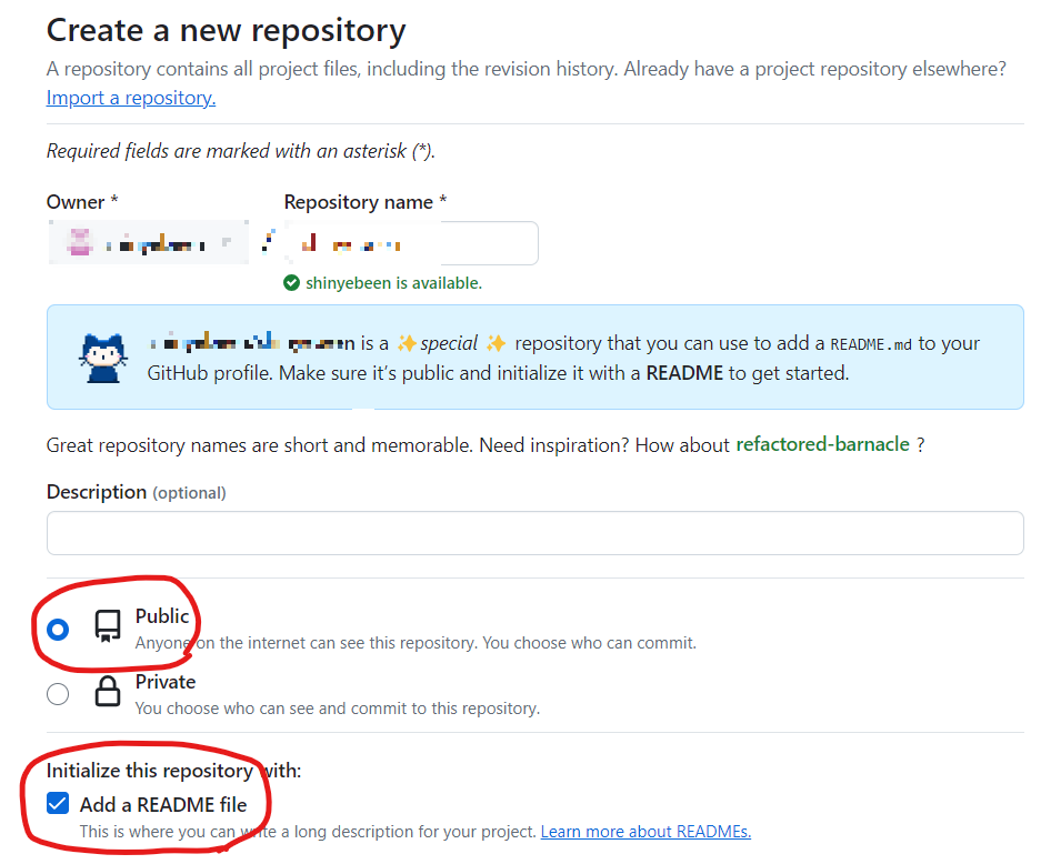 스페셜 레포지토리라고 깜찍하게 알려준다. 빨간색으로 표시해둔 부분 체크해주고 생성해준다.